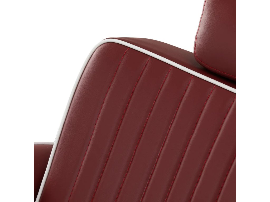 Stylové prošívání a čalounění v odstínech červené mu dodávají jedinečný charakter a dokonale doplňují dekor moderních holičství.