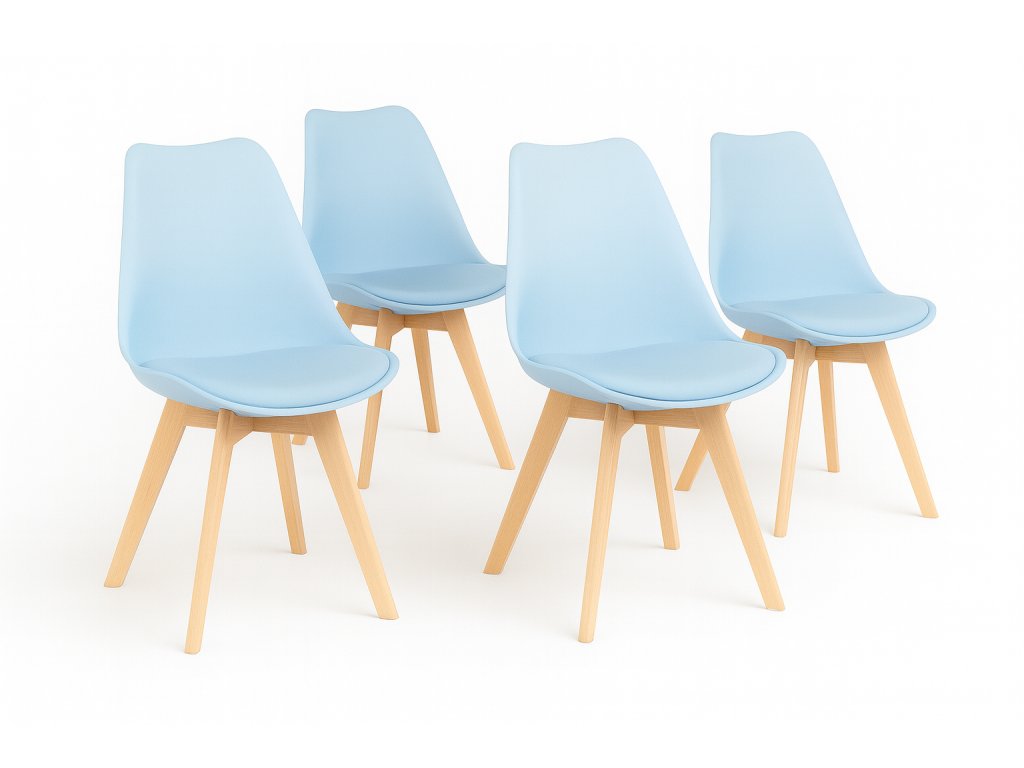 Jídelní židle má plastový korpus v barvě modré a pohodlný čalouněný sedák potažený koženkou také v barvě modré.