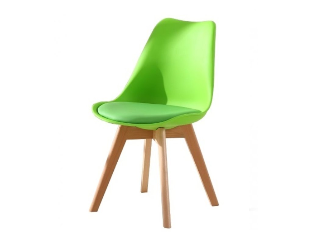 Jídelní židle má plastový korpus v barvě zelené a pohodlný čalouněný sedák potažený koženkou také v barvě zelené.