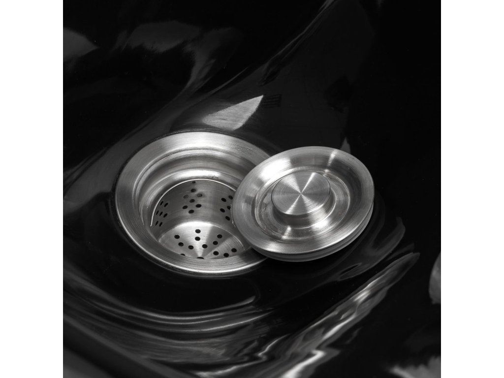 Vyhrazené místo pro odložení sprchové hlavice usnadňuje práci a chromovaná zátka se speciálním sítkem umožňuje regulovat průtok vody a udržovat vysoký hygienický standard v salonu.