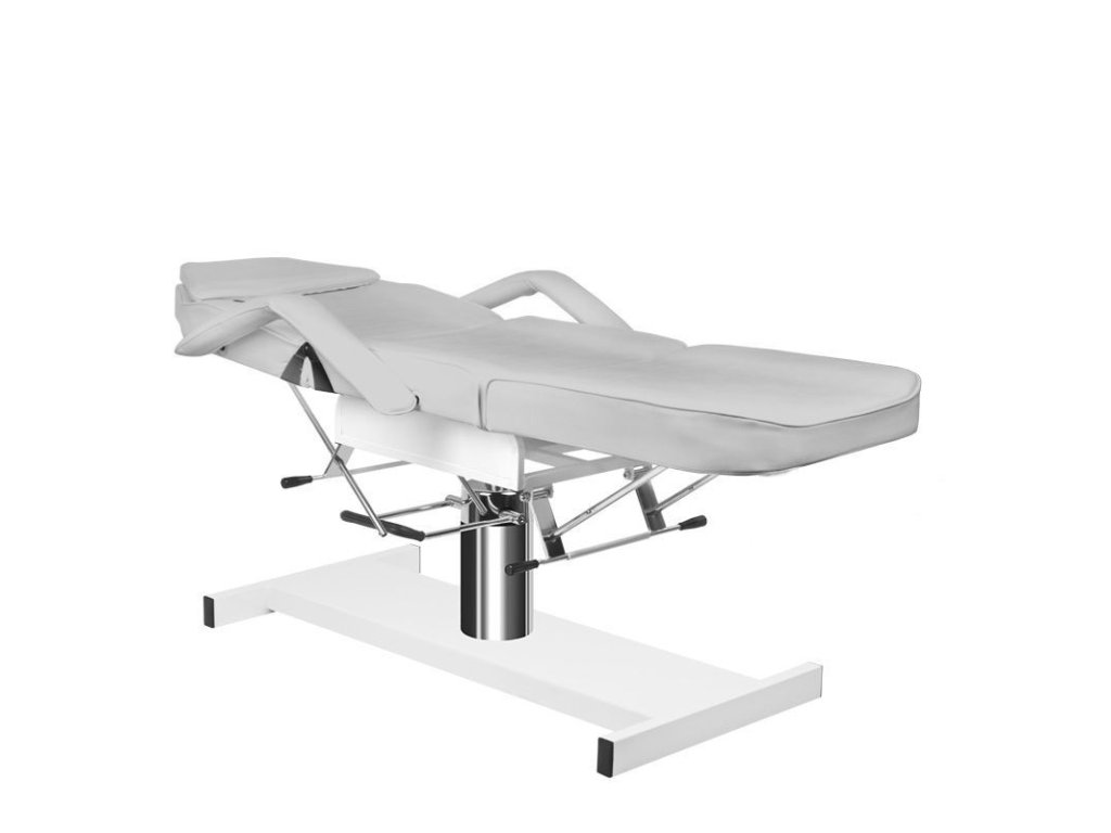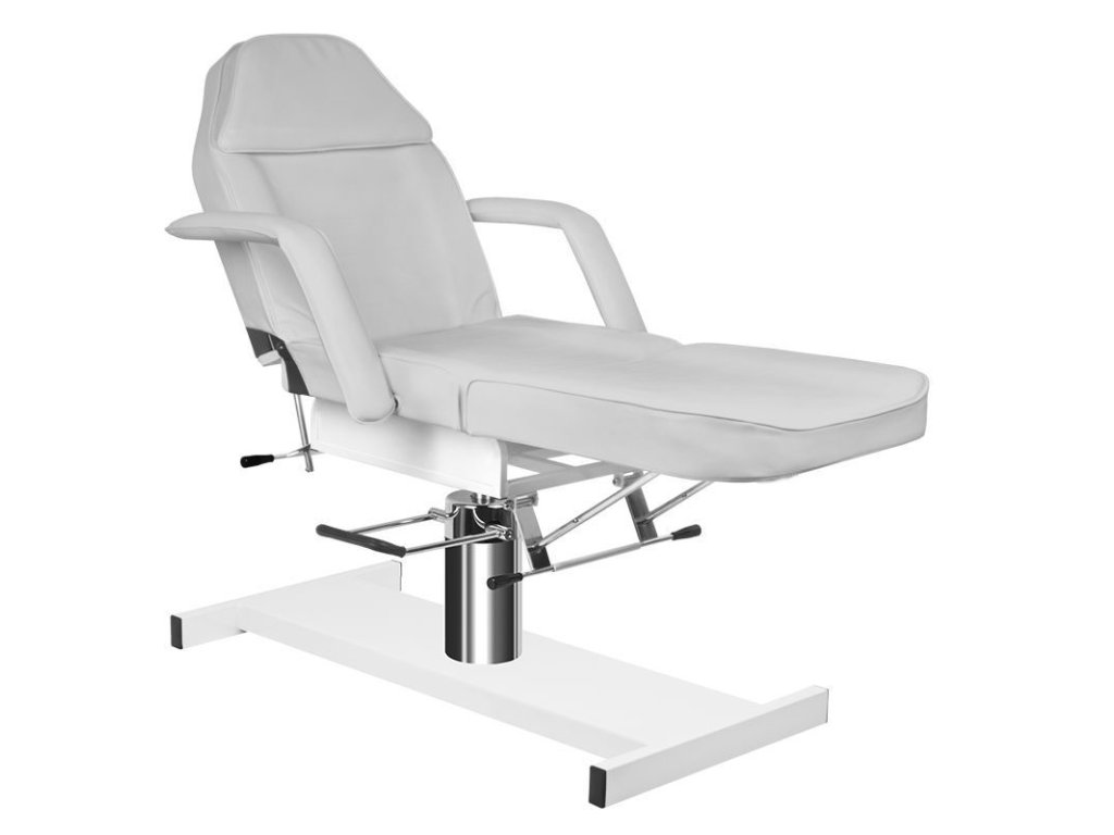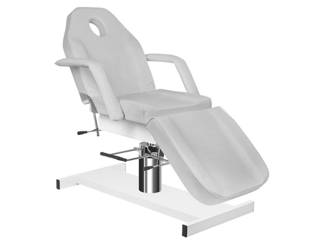 Otočné hydraulické křeslo, hydraulickým zvedáním a spouštěním, s otvorem v opěrce hlavy, ideální pro kosmetiku, pedikúru, vizáž a masáž. Područky jsou odnímatelné, v opěrce hlavy je otvor pro obličej. Čalounění křesla je vyrobeno z ekologické kůže, snadno se čistí.