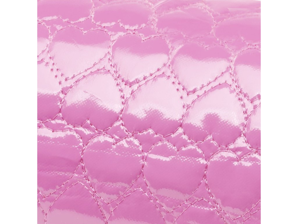 Stylový obal v barvě růžové je vyroben z lesklého syntetického materiálu a zdoben prošívanými srdíčky.