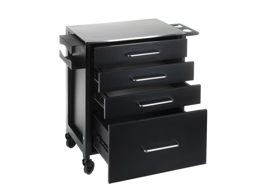 Tři malé zásuvky a jedna velká, prostorná skříň pojme vybavení, příslušenství a mnoho dalších pomůcek. Boční panely nástrojů, zásuvky jsou vybaveny chromovanými madly na traverzách s kuličkovými ložisky. Vše, co potřebujete během sezení, je organizováno na jednom místě.