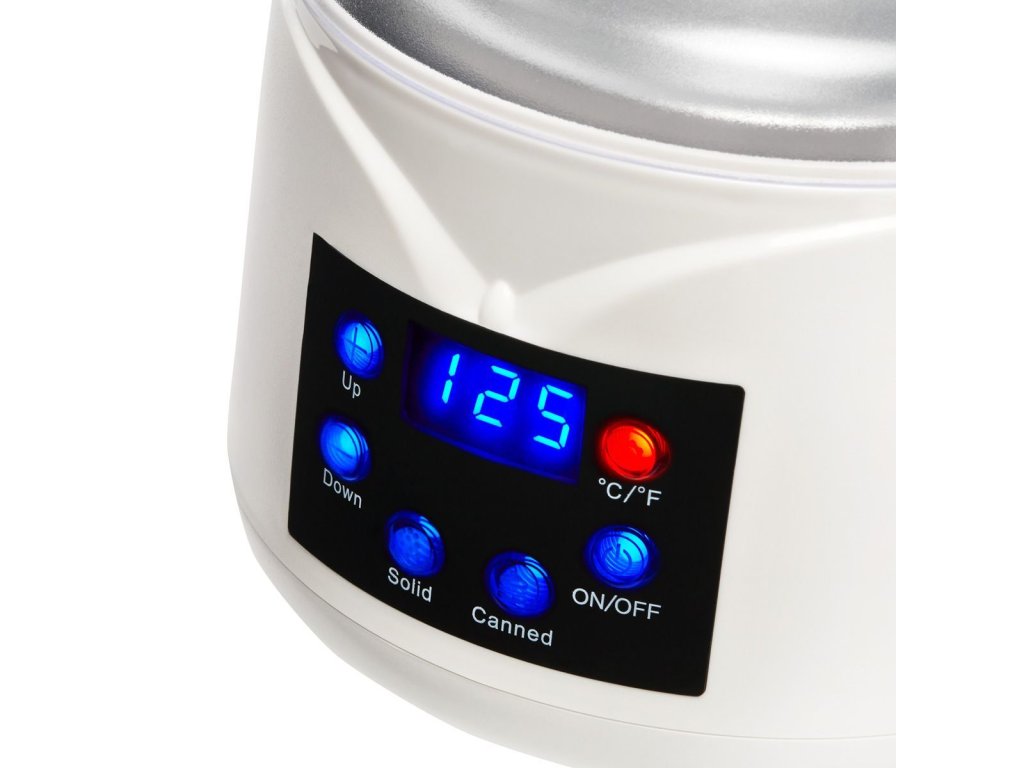 Ohřívač vosku AM-220 100W automat Profesionální ohřívač vosku s termostatem a zobrazením teploty a možností práce ve dvou režimech. Je vhodný pro všechny druhy depilačních vosků v plechovce, tvrdý vosk, dražé (k ohřívači je připevněn kbelík, ve kterém můžete roztavit tvrdý vosk nebo perleťový vosk). 1) Prvním provozním režimem je ruční ohřev. To znamená, že výchozí teplota po spuštění je 90. Pomocí tlačítek "Nahoru" a "Dolů" můžete upravit požadovanou teplotu ohřevu. Rozsah nastavení je od 45 °C do 125 °C. V tomto režimu svítí všechna tlačítka a lze ovládat všechny funkce. 2) Druhý provozní režim je 40minutový režim rychlého automatického ohřevu. Tento režim je vhodný pro ohřev voskových bobů. V ručním režimu vytápění krátkým stisknutím tlačítka "Trvale" přepnete do automatického režimu. V tomto režimu se jednotka automaticky zahřívá na 125 °C po dobu 40 minut a poté se přepne na 90 °C konstantní ohřev. Když se na displeji zobrazí 90 °C, spotřebič dvakrát pípne, což znamená, že má nastavenou teplotu. Technická data: Výkon: 100 W Napětí: 220V-240V (60Hz) Kapacita: 400 ml Teplota: 45 - 125 stupňů C. Poznámka: * Nezahřívejte bez vosku. Neponořujte do vody. * Ujistěte se, že napětí, které používáte, odpovídá zařízení * Nedoporučuje se používat na pokožku s alergiemi, jizvami nebo pupínky. * Před použitím zkontrolujte, zda je teplota vosku vhodná pro pokožku * Před čištěním odpojte napájení