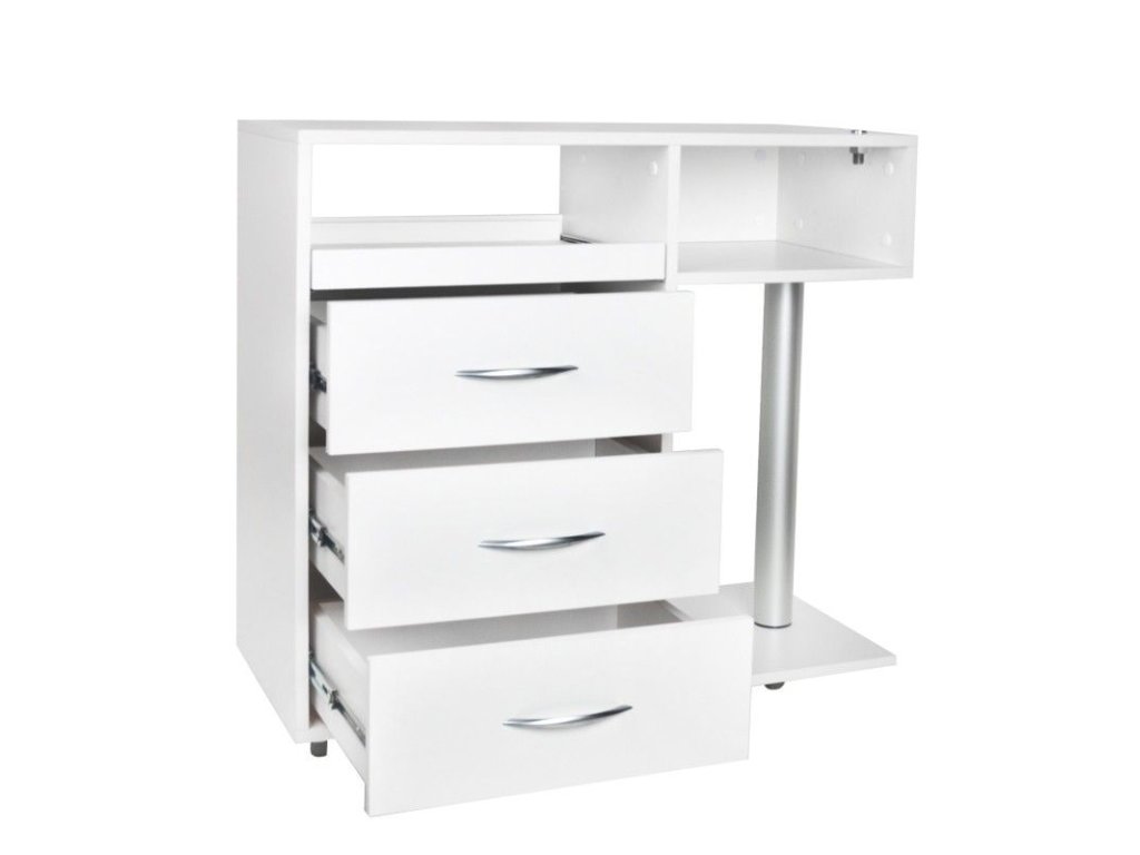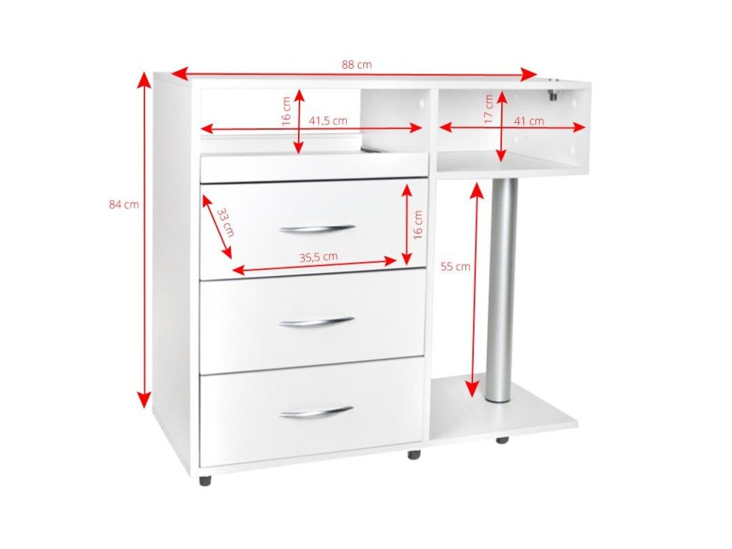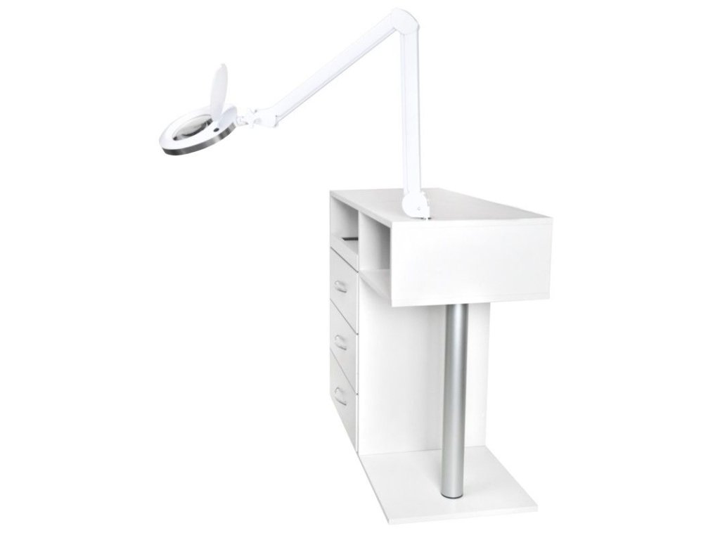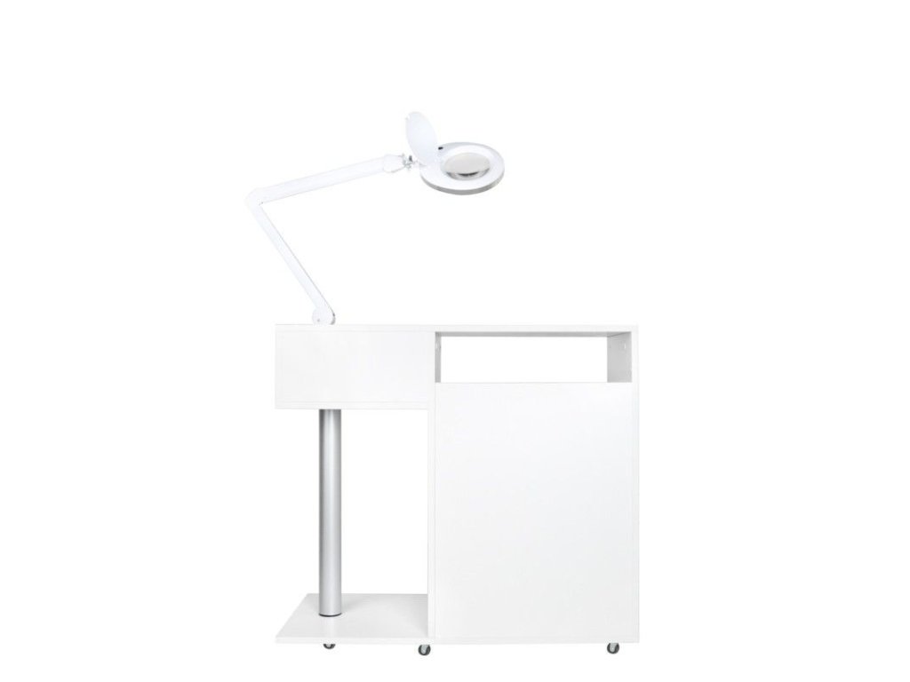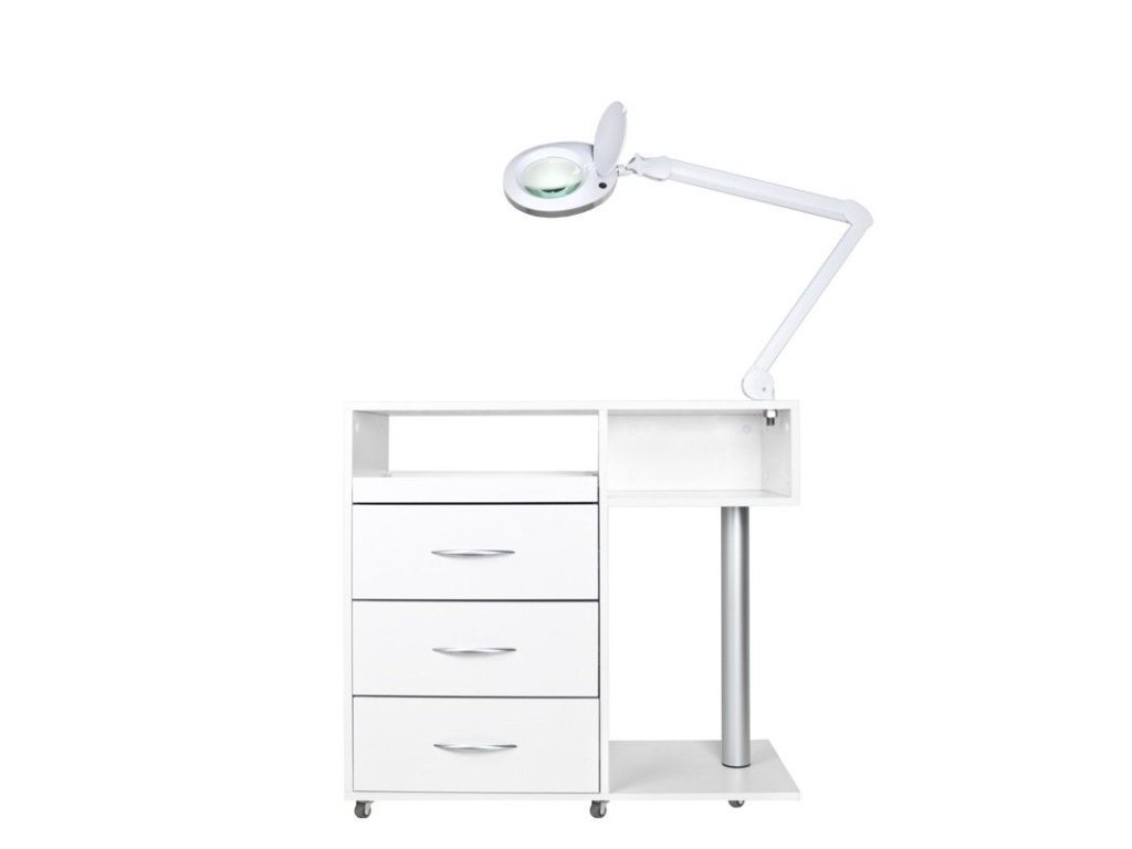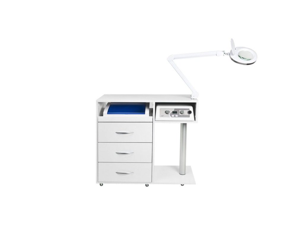 Profesionální pedikérský pomocník, solidně vyrobený, se zásuvkami společně se speciální zásuvkou na sterilizátor UV-C a policí na frézku. Dále obsahuje úchyt na lampo-lupu (TUBE) a kovovo-gumová kolečka, zajišťující mobilitu. Pomocník byl vytvořen s cílem usnadnit práci osobám vykonávajícím pedikúru. * přístroje a produkty zobrazené na obrázcích nejsou součástí baleníDoplňkové parametry