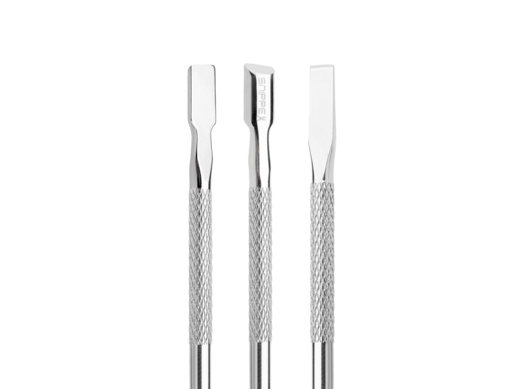• Ploché dláto se používá k obrušování epidermis a přesnému odstranění kutikuly a filmu. Bude také dobře fungovat pro odstranění zbytků gelu nebo akrylu z nehtové ploténky.